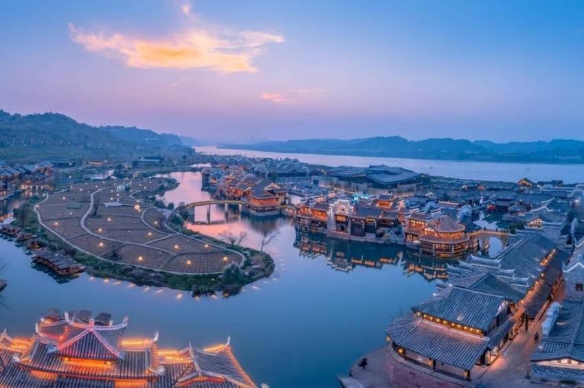 李庄古镇月亮田:位于宜宾翠屏区,60亩水街流畅其中,86栋仿古设置飞檐翘角、拔地而起,亭台楼榭、小桥活水井水不犯河水。开展非遗演艺舞草龙、水调歌头·水上景色跳舞、繁华盛焰·水上川剧火艺、山高水长·凤凰飞舞饰演、月湖雅韵·水上民乐演艺等特质作为。
