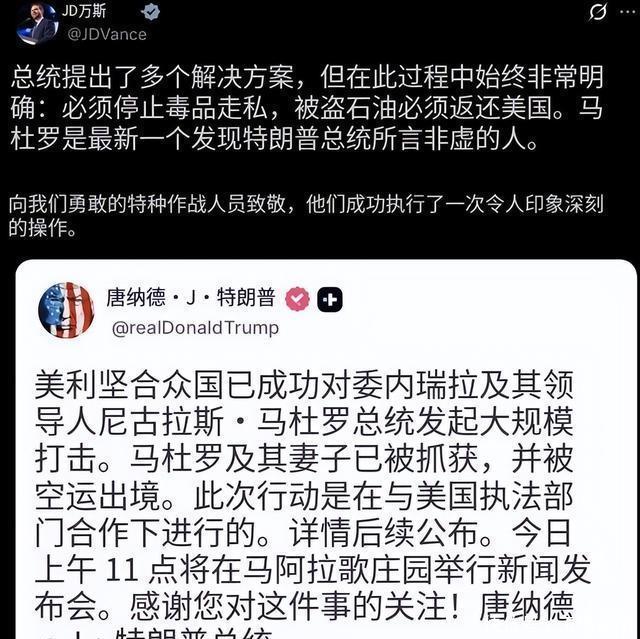 正直全宇宙还在消化这个重磅新闻,还在为好意思国堵截加拉加斯电力供应、这种赤裸裸的入侵步履感到惊骇时,剧情出现了致命的回转。 谁能念念到?亲手掀起这张“正义牌桌”的,竟然是特朗普最亲密的副手——万斯。